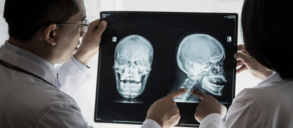 A telerradiografia frontal oferece uma visão frontal do crânio, complementando a análise lateral para um diagnóstico completo.