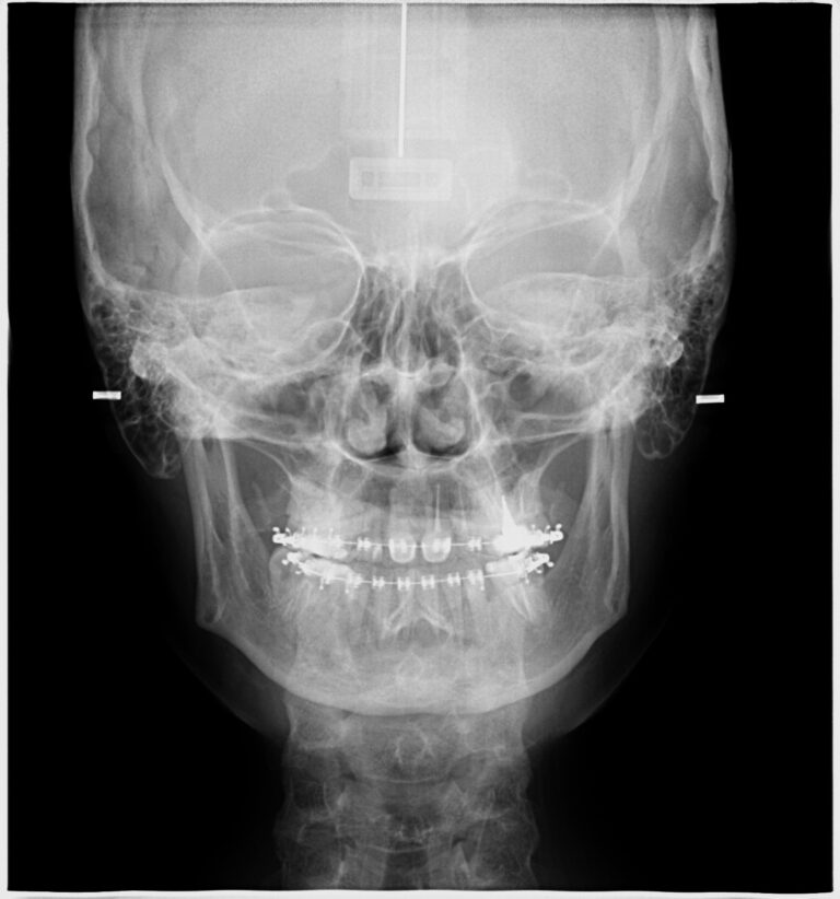 A telerradiografia frontal oferece uma visão frontal do crânio, complementando a análise lateral para um diagnóstico completo.