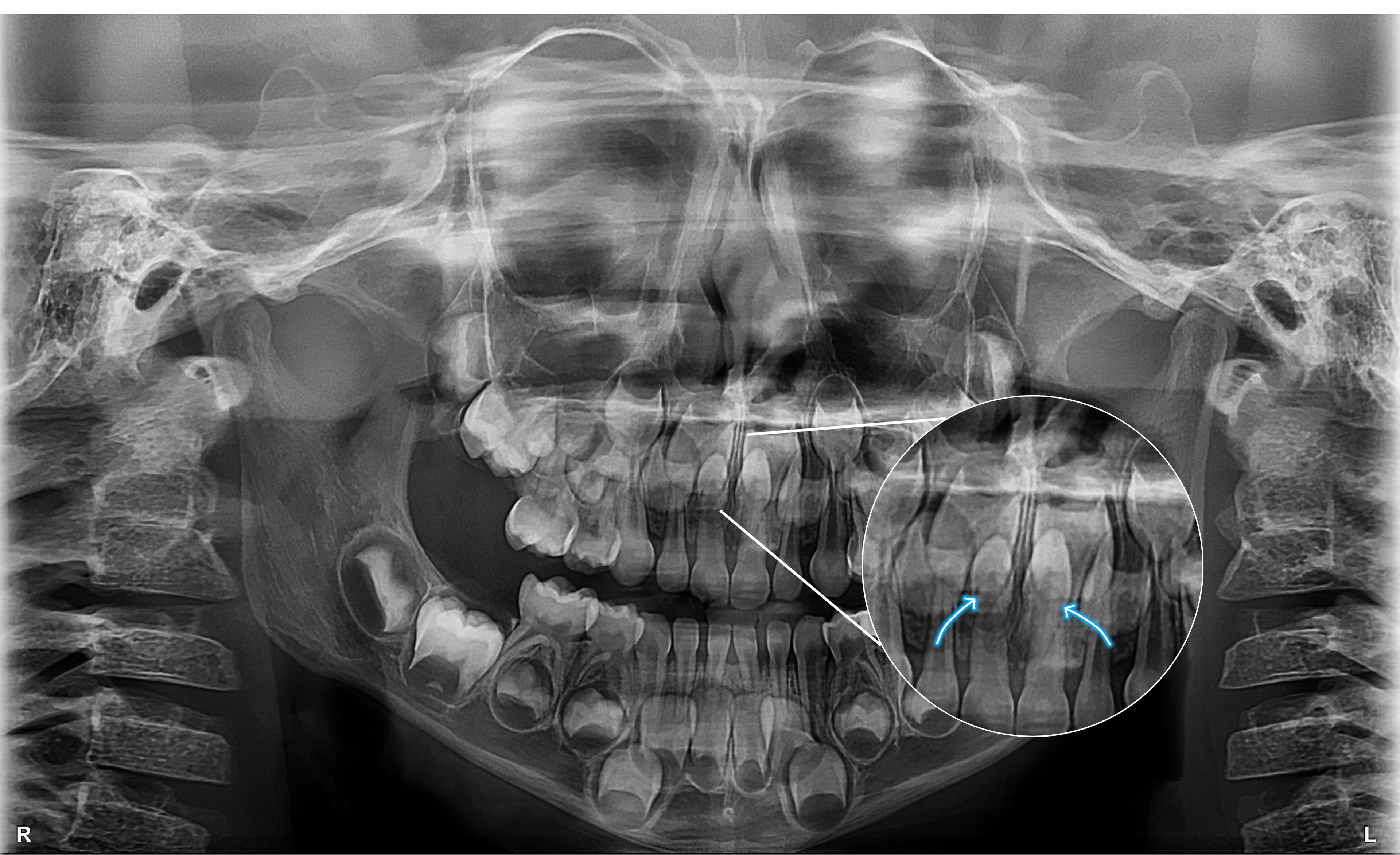 Além de acompanhar a troca dentária, o exame é essencial para detectar alterações que muitas vezes não são perceptíveis no exame clínico, como a presença de dentes supranumerários — dentes extras que se formam além do número normal.